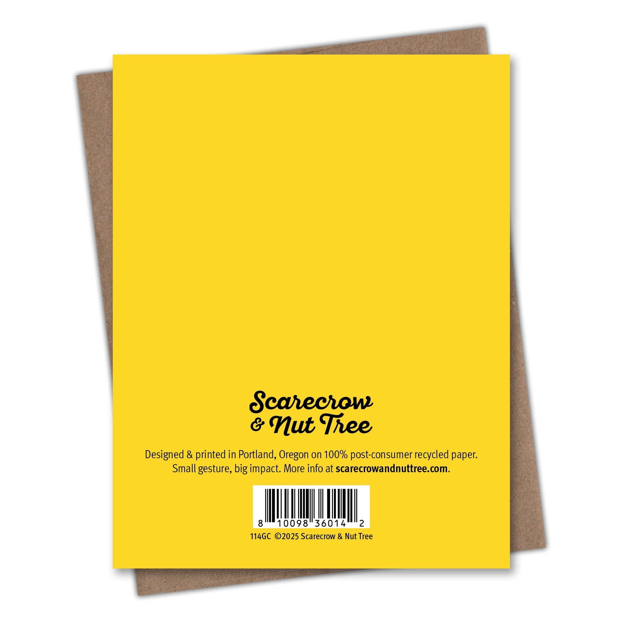 This Birthday card is printed on 100% recycled paper because we love trees as much as we love helping you connect. All Scarecrow & Nut Tree greeting cards are blank inside, which means you can write whatever you want. We’re partial to something personal, playful, or punny. But you do you. Comes with a recycled Kraft envelope so the whole thing is easy on the eyes and the earth. A2 Size: 4.25" x 5.25"