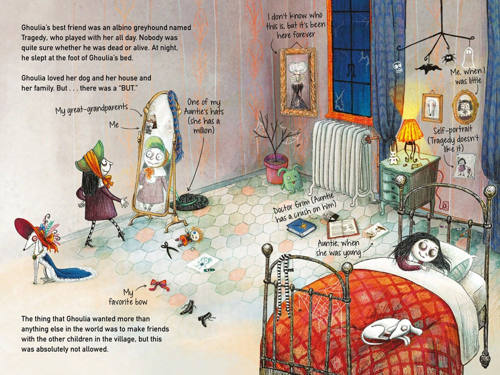 In search of a real friend, Ghoulia tries to venture past the manor’s walls, but she can’t hide her pale green skin or the deep purple circles under her eyes. The other children will be afraid of her, and no one will want to be her friend.