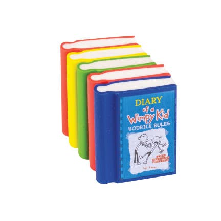 EXCLUSIVE! Diary of a Wimpy Kid Book Erasers - 72659 Book-shaped erasers inspired by the beloved Diary of a Wimpy Kid series! Includes five designs: the classic Diary of a Wimpy Kid (red), the hilarious Rodrick Rules (blue), the adventurous The Last Straw (green), the comical Hot Mess (red), and the fun-filled Dog Days (yellow). These erasers are not only functional, but also a fun addition to any desk or stationery collection. Perfectly sized at 1.25” x 1.5” and a thickness of .4375”