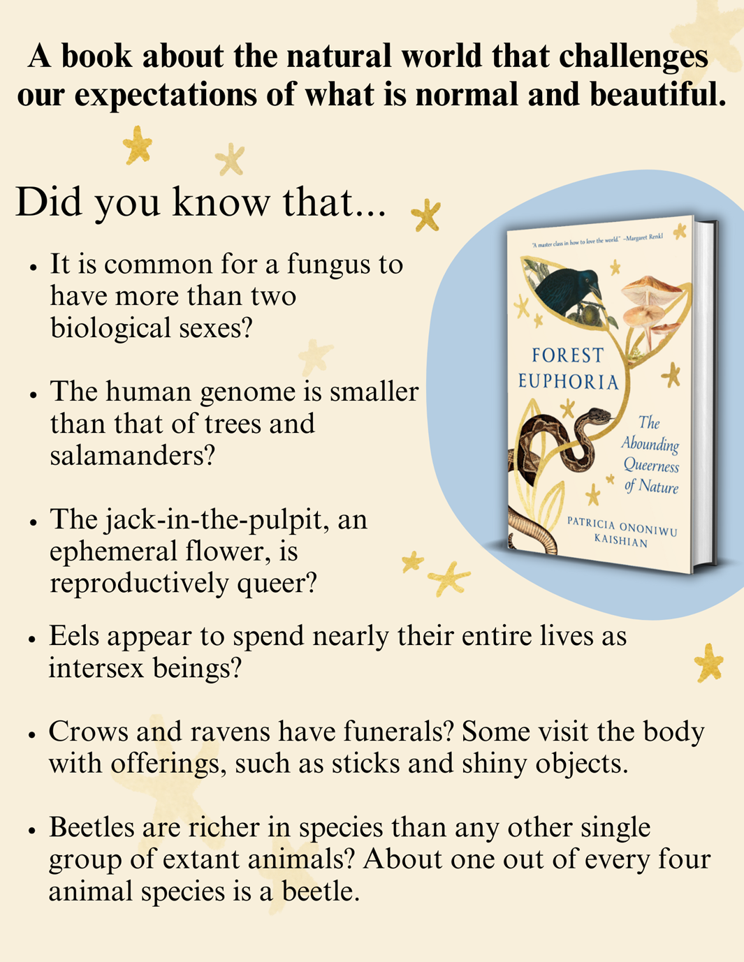 In Forest Euphoria, Kaishian shows us this making of a scientist and introduces readers to the queerness of all the life around us. Fungi, we learn, commonly have more than two biological sexes—and some as many as twenty-three thousand. Some intersex slugs mutually fire calcium carbonate “love darts” at each other during courtship. Glass eels are sexually undetermined until their last year of life, a mystery that stumped scientists once dubbed “the eel question.” Nature, Kaishian shows us, is filled with the unusual, the overlooked, and the marginalized—and they have lessons for us all.