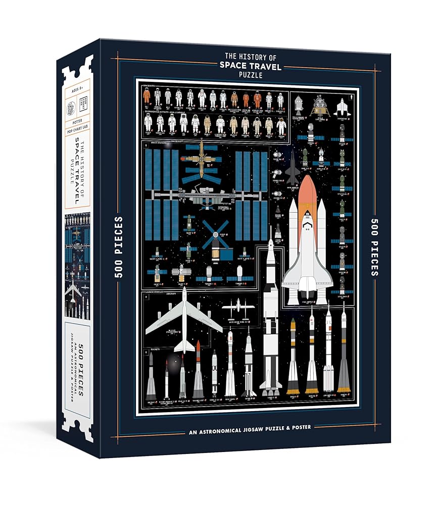 This illustrated 500-piece puzzle celebrates every crewed space mission since 1961 and includes a full-color reference poster with the puzzle design on the front and a complete timeline of missions on the back. Packaged in a sturdy box, it's a stellar gift for science lovers, students, game geeks, and more.