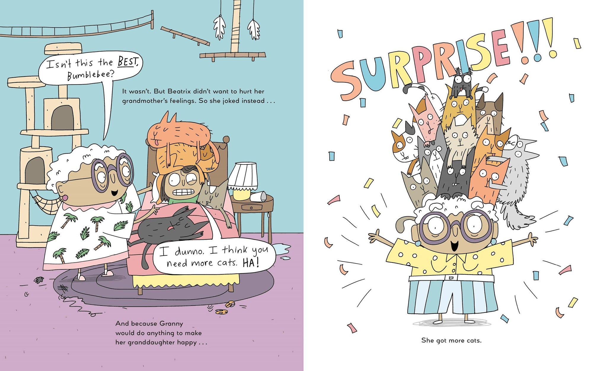 So Bea comes up with a plan to keep Granny company during the week: a cat! Granny is a little confused because she doesn't remember mentioning that she likes cats, so she asummes that Bea must want a cat around when she visits. And in doting grandmother fashion, βwhatβs better than one cat?β she reasonsβmore cats!
