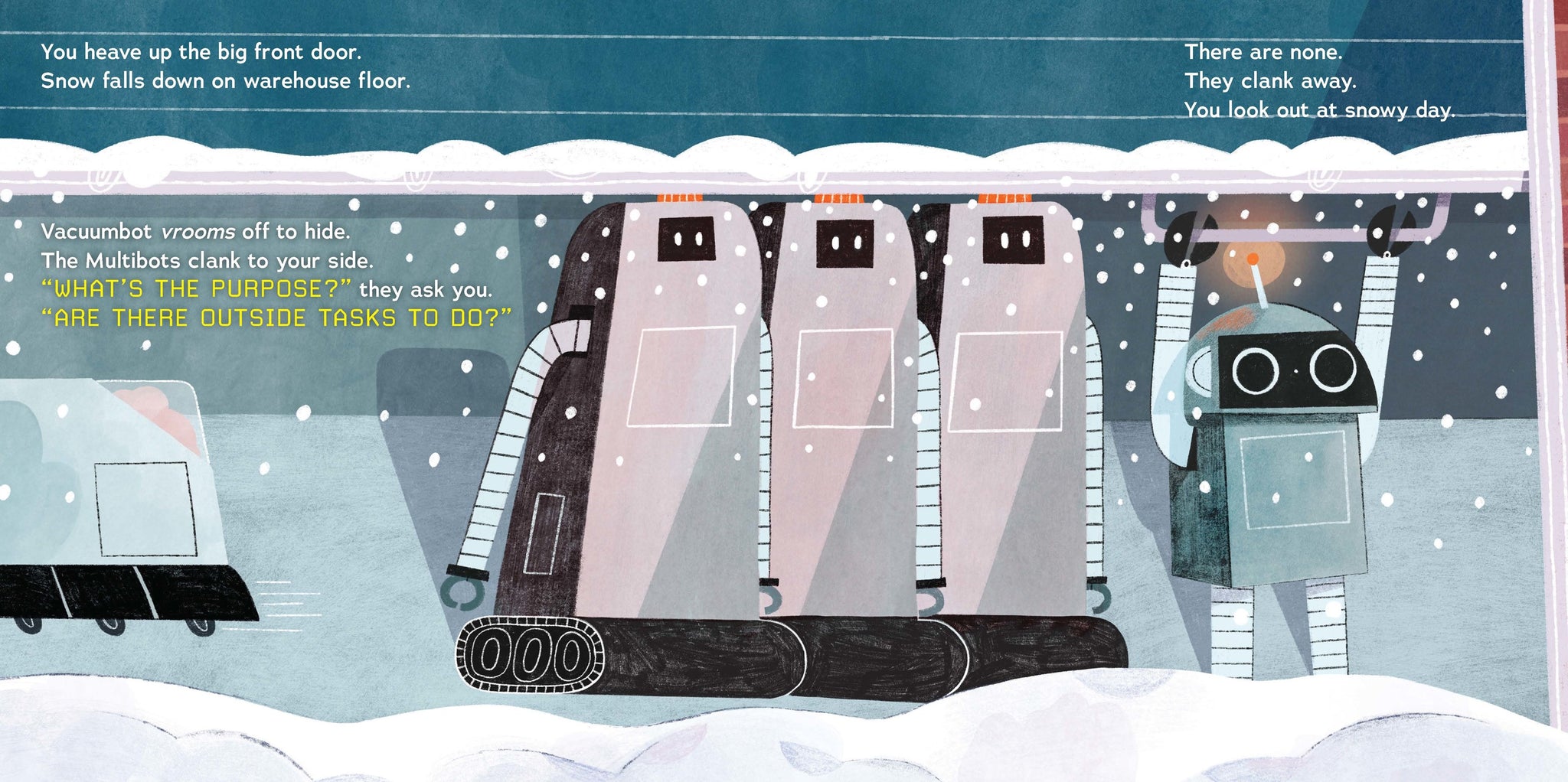 All day in the factory, Robot sorts and stacks. At night, he wishes the other bots could play, but they're programmed to work, and work, and work.