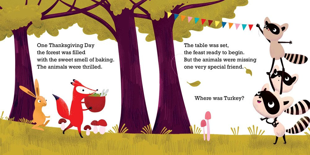 Thanksgiving has arrived, and Turkey’s friends invite him to come over and celebrate. But Turkey kindly denies every dinner invitation: β€œNo, thanks.” What could the star of the day be up to? The animals decide to find out!