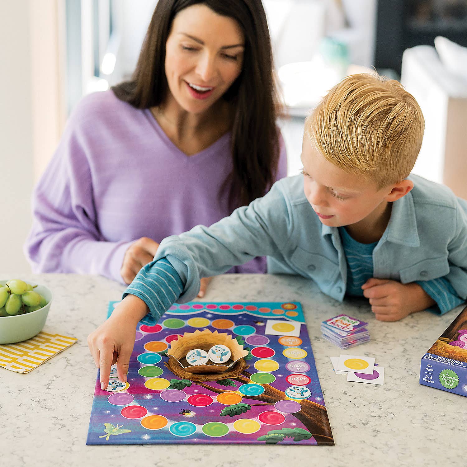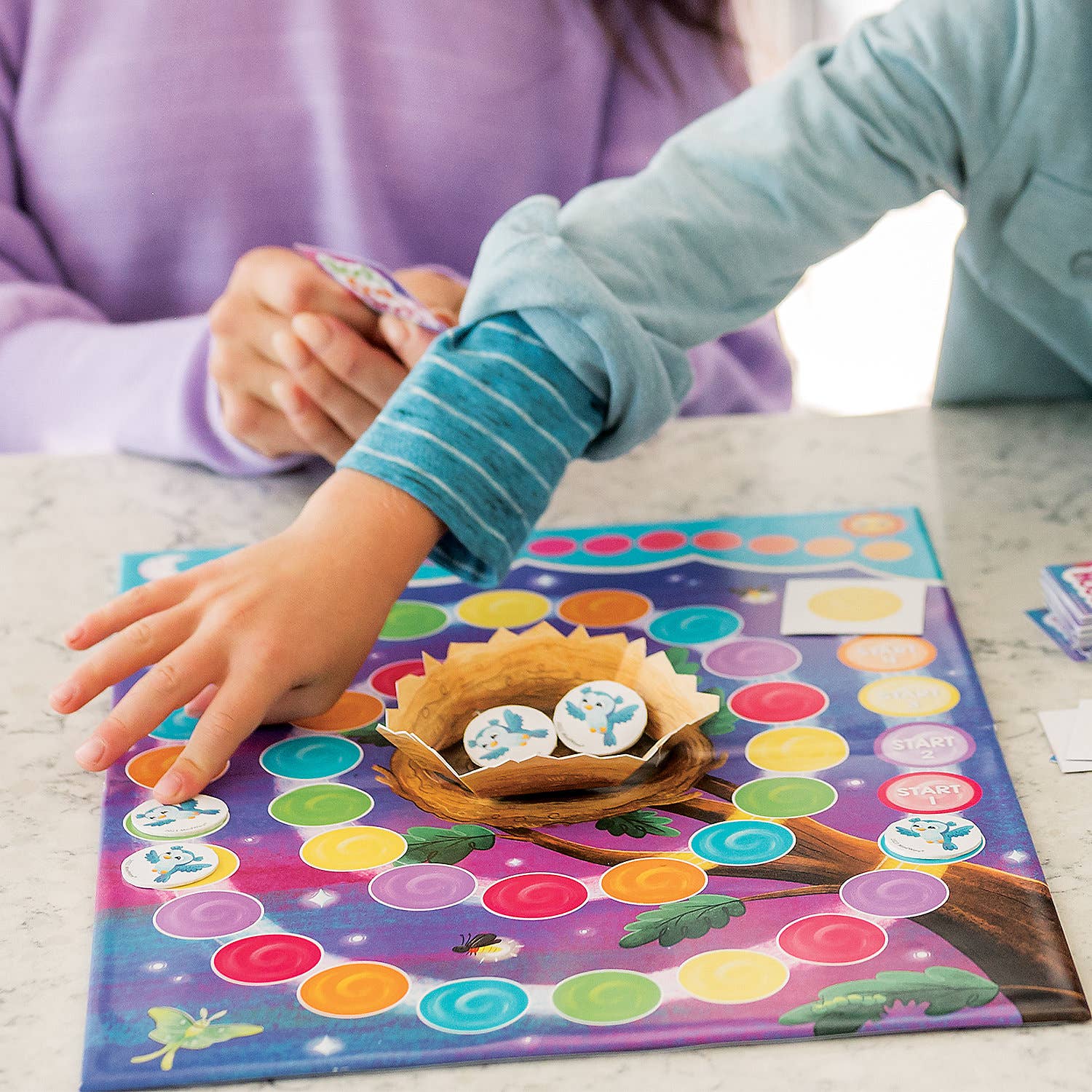 Players work together to help the owls fly back to their nest before the sun comes up. Don’t leave anyone behind! Play a color card and choose any owl to fly to that space. Draw a sun card, and the sun moves one step closer to daylight. Help all the owls get home before the sun rises and everyone wins!