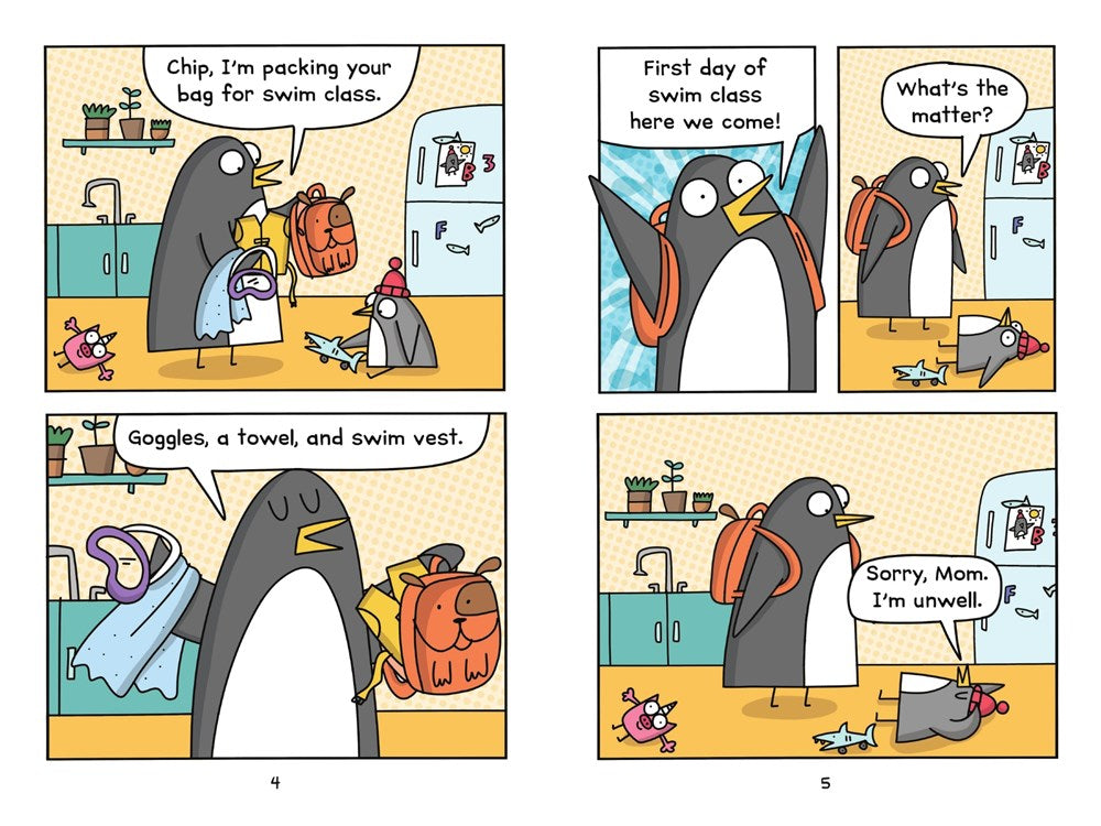 Chip, the little penguin, tries to get out of swim lessons in this hilarious Level Two I Can Read Comic by Maddie Frost.