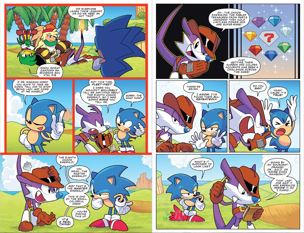 Fang the Hunter is always on the lookout for treasure, and rumors of an eighth Chaos Emerald are too juicy to ignore. If anyone can find the too-good-to-be-true gem, it’s this crafty bounty hunter and his team: Bark the Polar Bear and Bean the Dynamite! And who better to get information about the Chaos Emeralds from than the likes of Knuckles the Echidna, Miles “Tails” Prower, and Sonic the Hedgehog himself!
