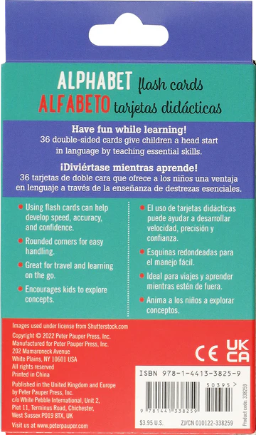 * 36 double-sided cards give children a head start in language by teaching essential skills. / 36 tarjetas de doble cara que ofrece a los niños una ventaja en lenguaje a través de la enseñanza de destrezas esenciales.