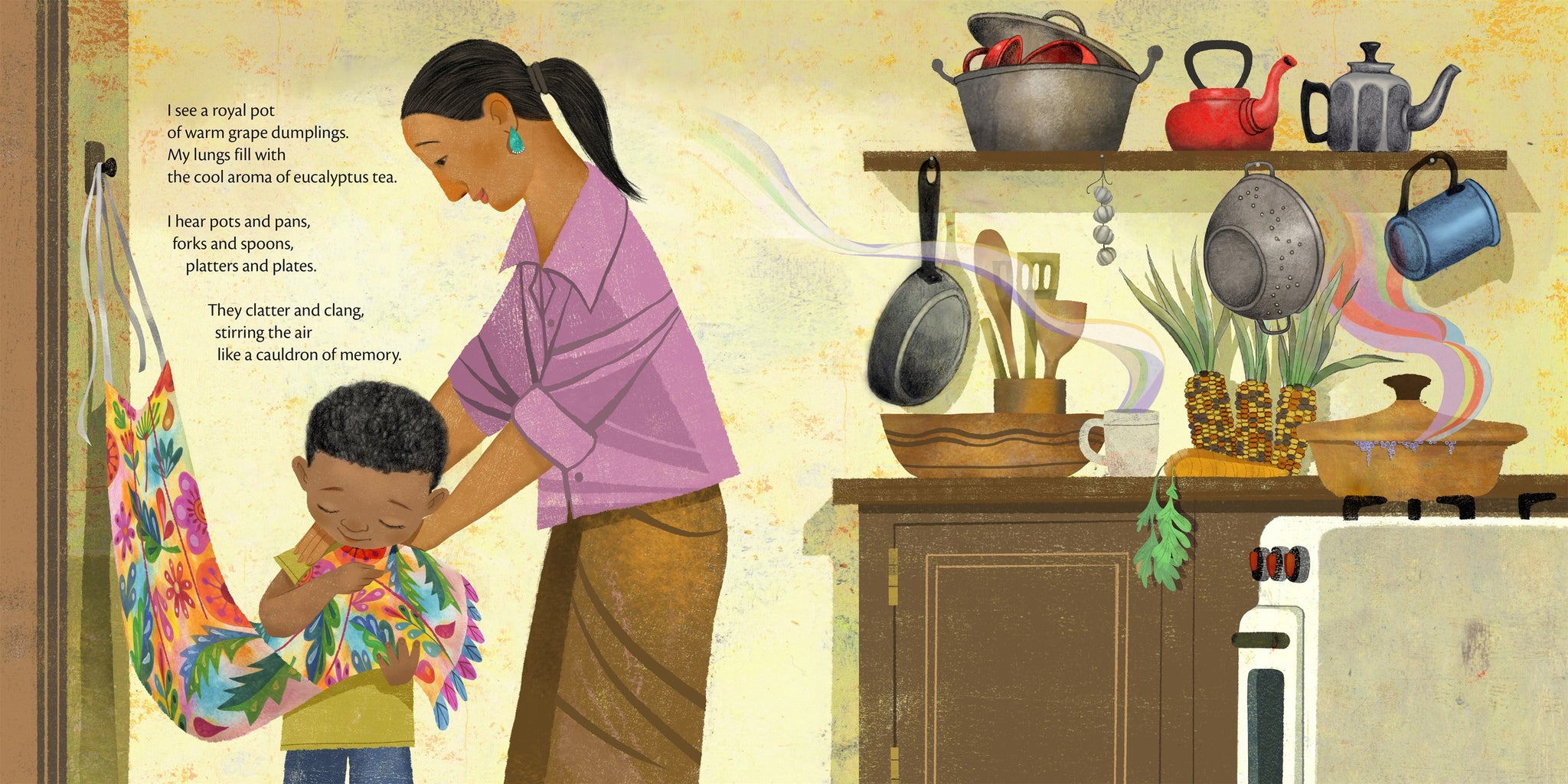 Even her house feels like it’s waiting for her return. Then as the boy approaches the kitchen, the scent and memories of her cooking assure him that no matter where she is, her love will always be close by.