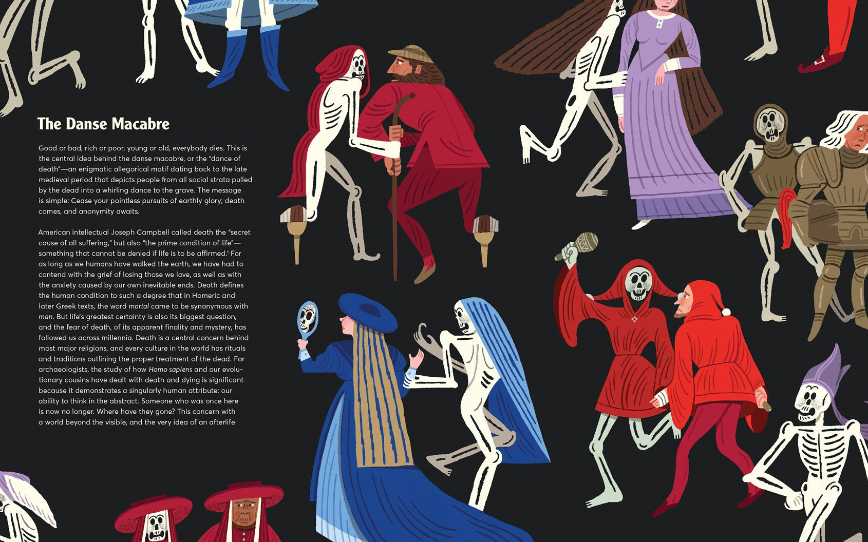 MARVELOUSLY MACABRE, TREMENDOUSLY THOUGHTFUL: Dynamic, full-color artwork accompanies informative and intriguing text, rendering everything in energetic detail—from a step-by-step breakdown of the embalming process to detailed diagrams of ancestral altars around the world.