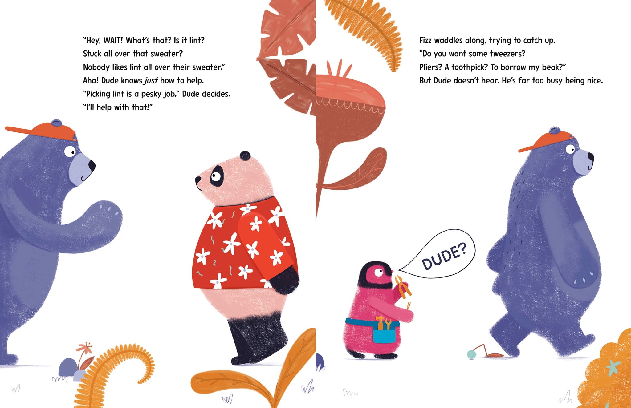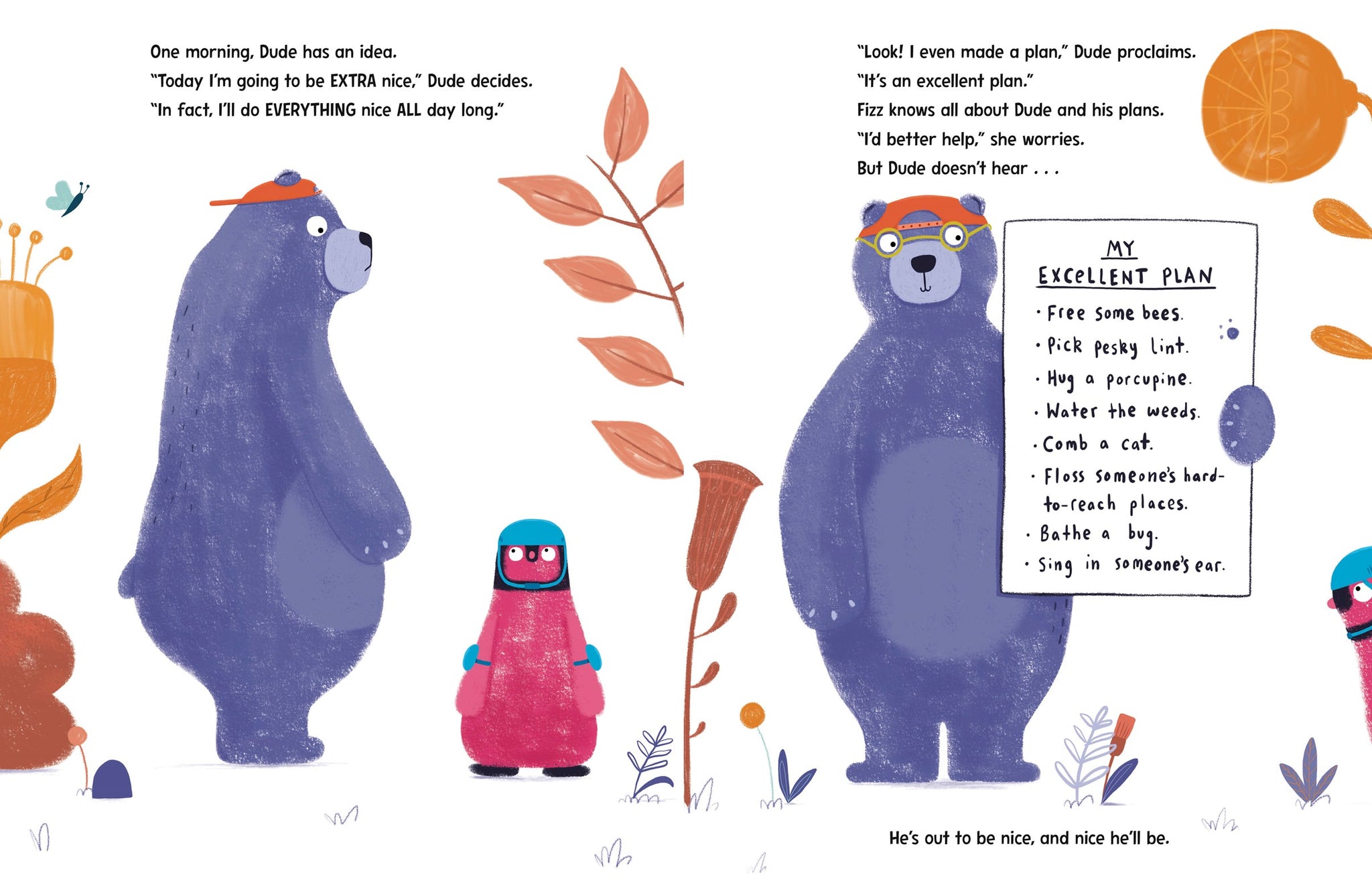 One day, Dude decides that he wants to do nice things for his friends and neighbors all day long. But Dude isn't exactly attentive and tends to forget the most crucial part of helping people: asking first. So when Dude unravels a sweater, frees some dogs, and ruins an ice cream social, he needs to reckon with his own niceness: is it really nice if he wasn't that helpful? Can Dude and his best friend Fizz save the day before Dude makes too big of a mess?