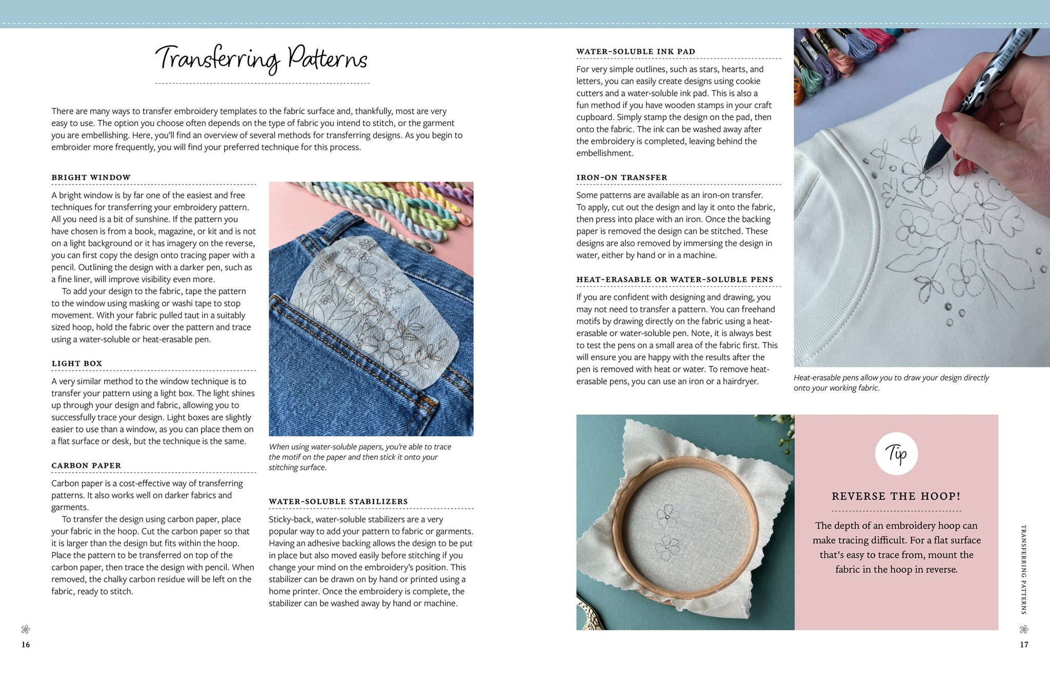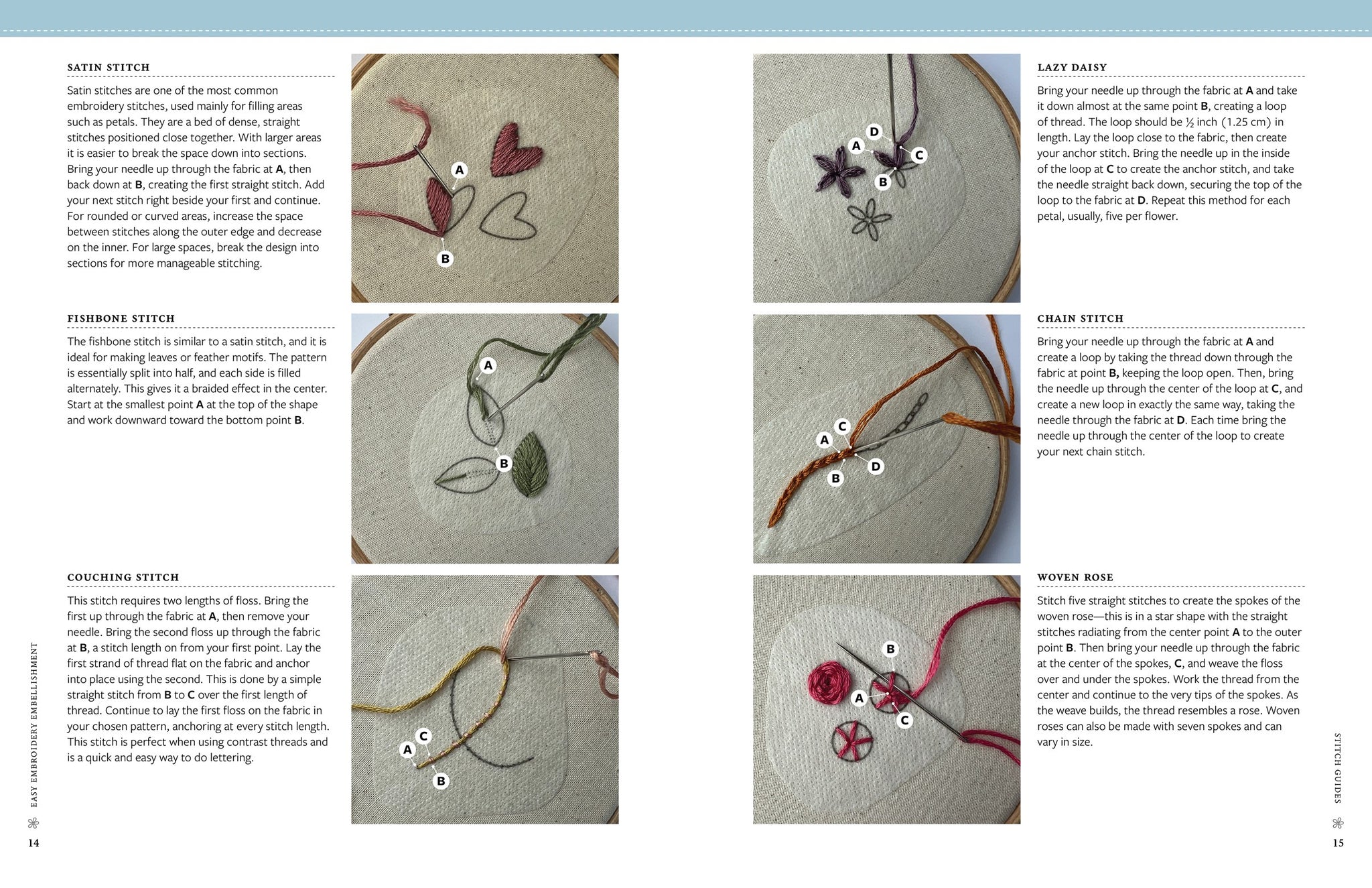 The book is thoughtfully organized to guide you every step of the way, from the basics of embroidery to more intricate designs. It starts with a comprehensive stitch guide, introducing essential techniques like the backstitch, satin stitch, French knots, and more. From there, you’ll move on to a collection of more than 30 embroidery projects, each with step-by-step photos and instructions to ensure success.