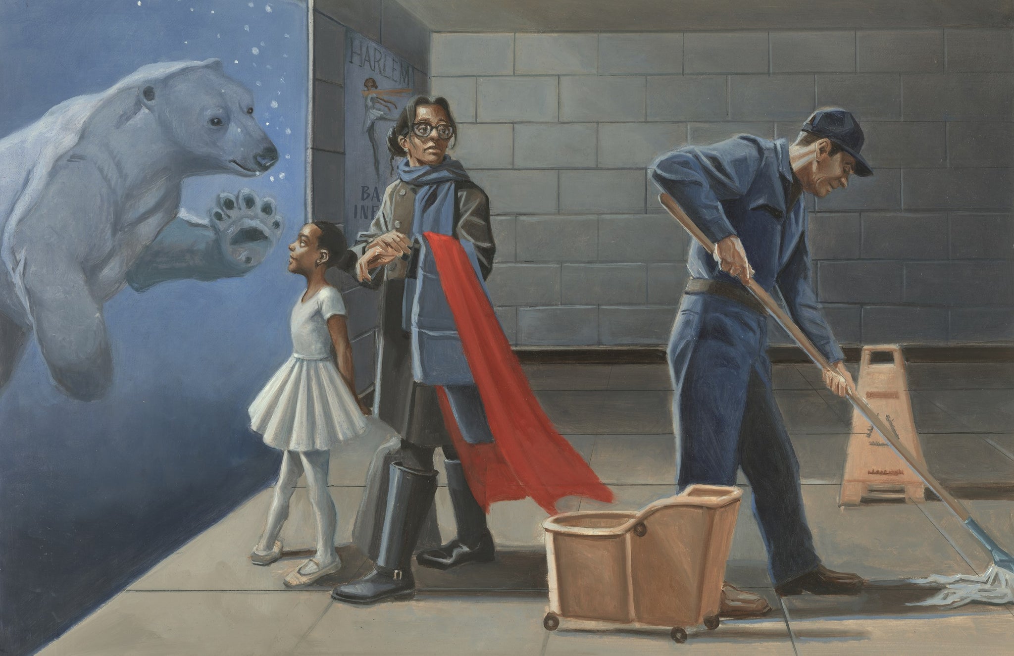 The wordless narrative is told through expressive and detailed oil paintings. On the endpapers, readers learn more about these loveable characters with illustrations of zoo signage about polar bears and a magazine article about the young ballerina.