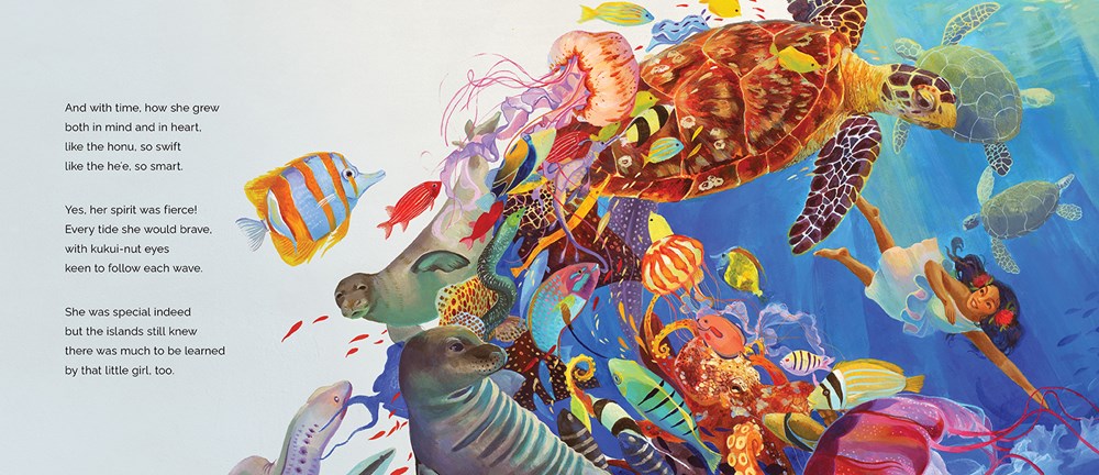 The beautiful poetry—weaving its way through every page—artfully blends 25 Hawaiian words into the English prose and provides a thoughtful exploration of the meaning of aloha in relation to the land, the people, and the lore. There is also a pronunciation guide and glossary providing additional information for those looking to learn more about the rich language and culture of Hawai’i.