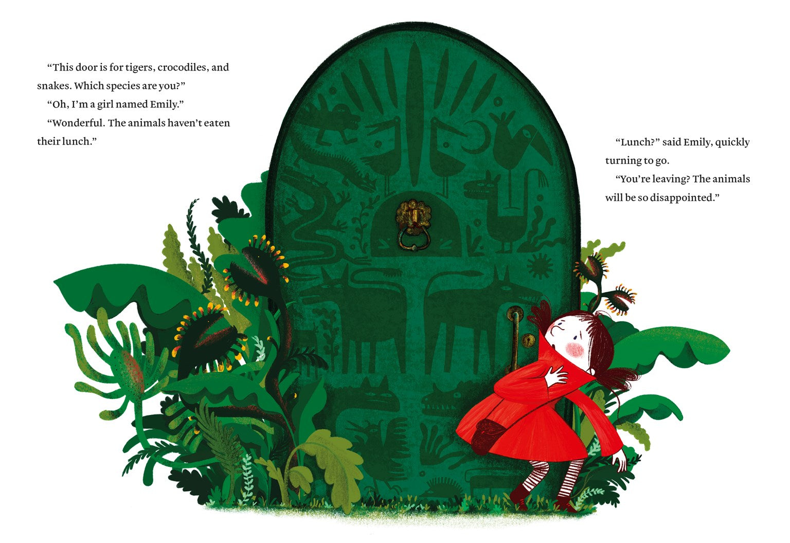 And so begins Emily's search for a door that will open. The first door is blue, and the voice behind the door tells Emily that she doesn't sound very bluish. The second door says it only opens for tigers, crocodiles, and snakes. But she is a girl named Emily-- and the animals are hungry--and so she moves on. The third is only for people who speak very quietly, and the door can hear Emily.
