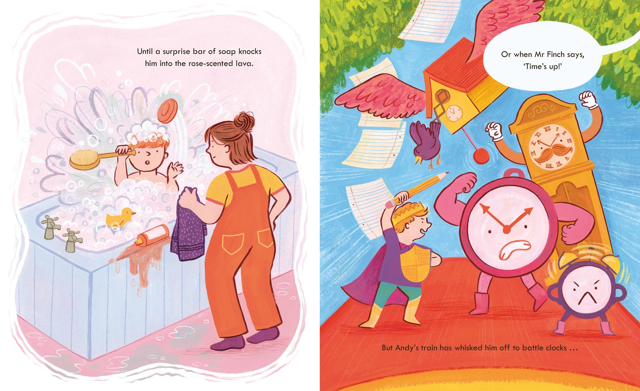 AN ADVENTURE-PACKED RIDE: Hayley Wells’ illustrations are bursting with colorful detail, as Andy’s train journey takes him from one inventive world to the next.