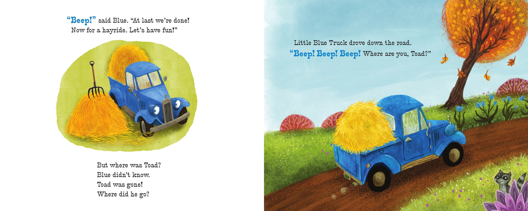Toad helps prepare for a hayride by loading piles of hay into Little Blue's truck bed. But when they're ready for a ride, Toad is nowhere to be found! Can Blue and his farm animal friends find Toad in time for him to join the fun?