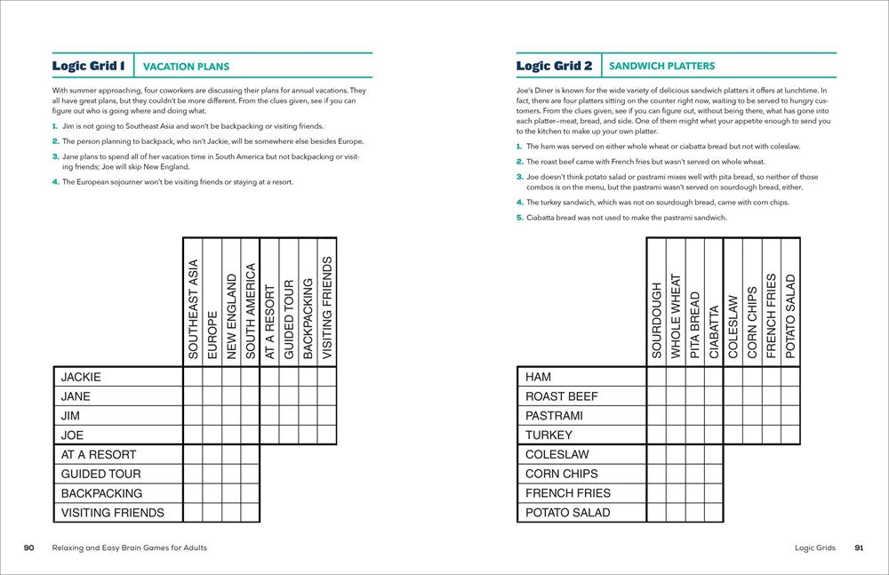 Guidance for getting started―Learn about the different types of brain games in this book, with instructions and tips for solving each kind and sample puzzles to use as a warm-up.